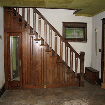 Staircase in front room, along with leaded glass window. Notice the simple geometric design in the balusters.