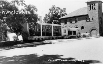 The Collins Street building was begun in 1949, and originally served Handy District No. 6 as an elementary school (this was before consolidation of the outlying country schools into Fowlerville Community Schools). The projected cost for the building was $65,000. The large windowed area was meant as a kindergarten classroom, while the office is just visible through the entryway. There were five other classrooms in the building. Eventually the building became part of Fowlerville Middle School, along with the former High School across the street, and was used by the school district until 1982. It is currently used as the Fowlerville Senior Citizen's Center.